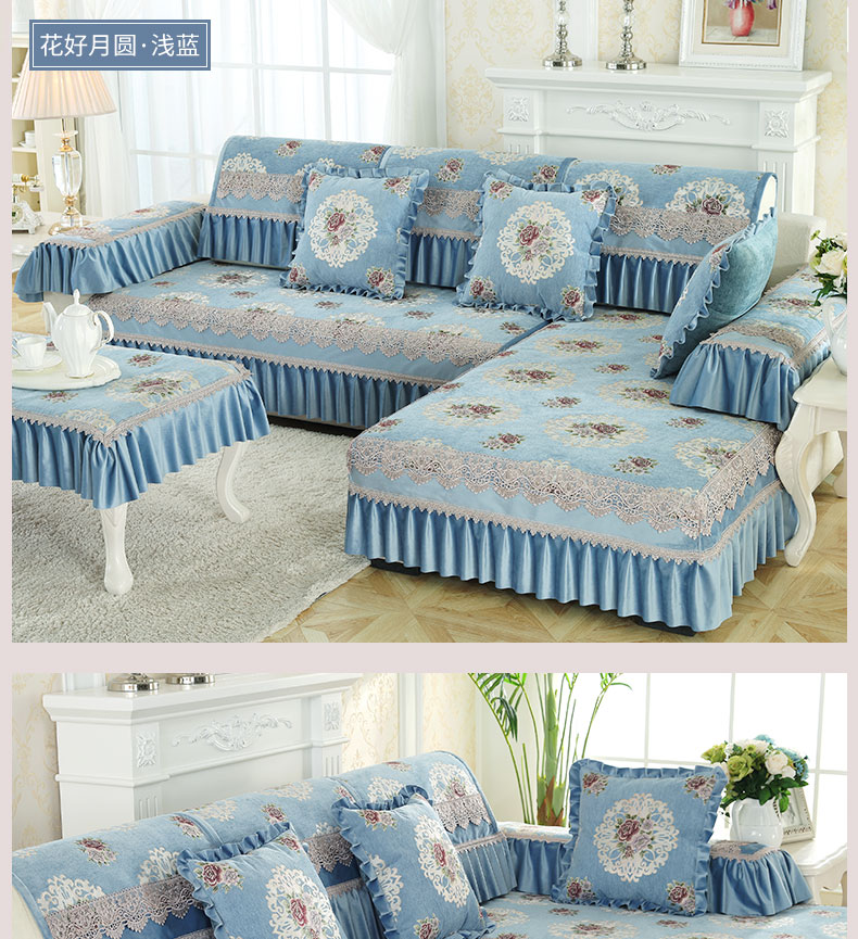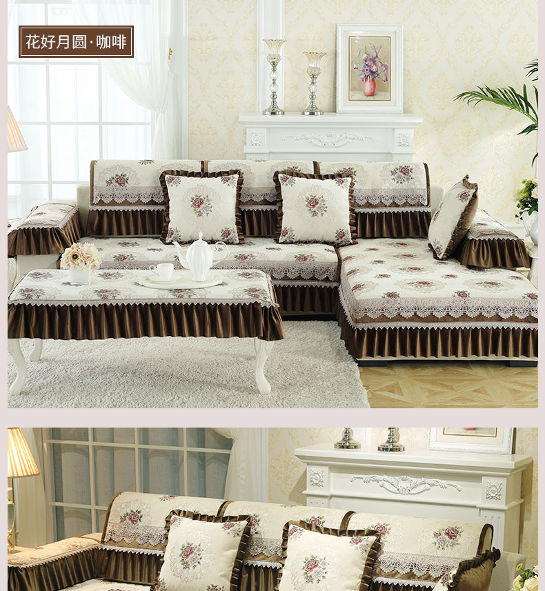 蘭麗坊ヨーロッパ式ソファマットセット滑り止めソファタオルレースの裾に布芸ソファーカバー全カバー四季通用のフルバックの貴妃席クッションは花好月円-コーヒー70+18裾*180 cm一枚をカスタマイズできます。