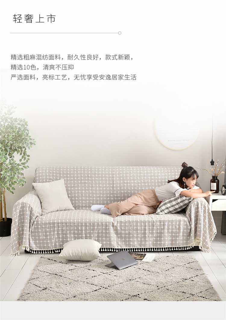 夢の中で花が茂っているソファーのタオルは全部厚いソファーのカバーをかぶせて綿麻の純色の格子の組み合わせの貴妃の砂を組み合わせて防塵カバーの浅いカレーの格の3人の位の200*300 cmを発表します。