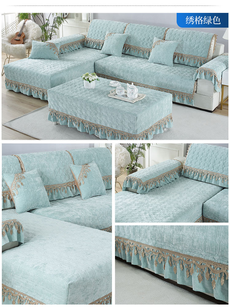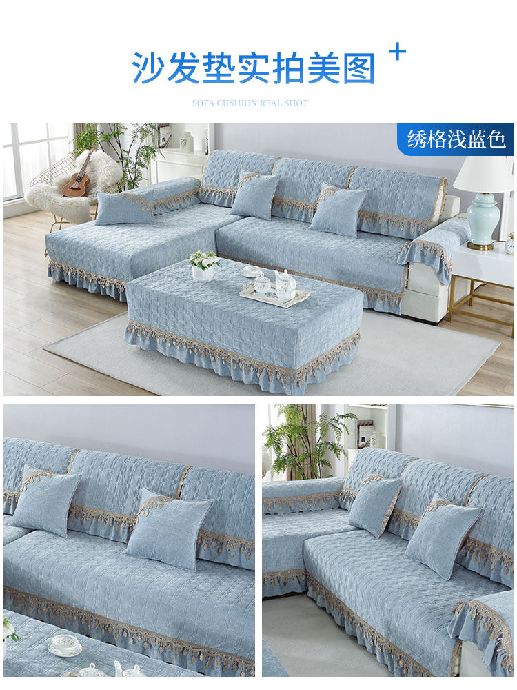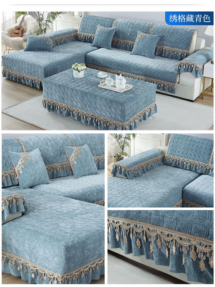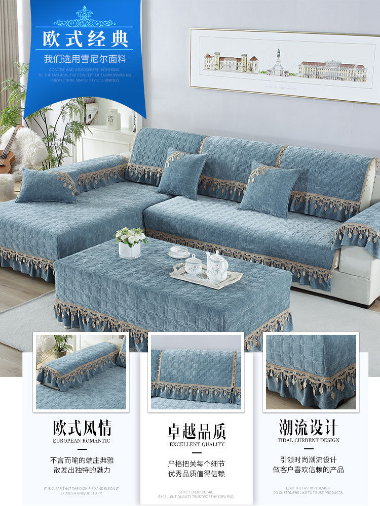 ヨーロッパ式の四季通用のソファーカバーのセットは滑り止めのシェニールの布のソファーマットを組み合わせて注文して作られた刺繍と紺色のオーダーメイドのセットです。(特殊サイズはオーダーメイドが必要です。カスタマーサービスに連絡してください。)